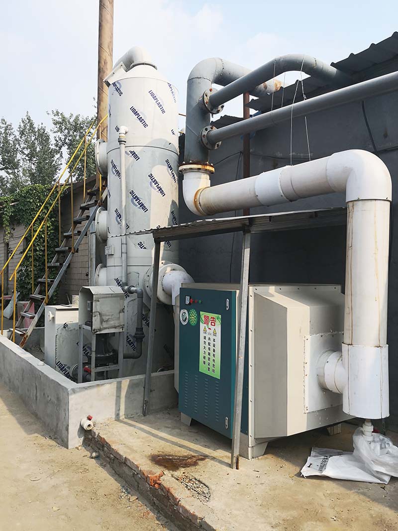 工作原理:廢氣凈化噴淋塔主要的運(yùn)作方式是廢氣由風(fēng)管引入凈化塔,經(jīng)過(guò)填料層,廢氣與氫氧化鈉吸收液進(jìn)行氣液兩相充分接觸吸收中和反應(yīng),廢氣經(jīng)過(guò)凈化后,再經(jīng)除霧板脫水除霧后由風(fēng)機(jī)排入大氣。吸收液在塔底經(jīng)水泵增壓后在塔頂噴淋而下,然后回流至塔底循環(huán)使用。凈化后的廢氣達(dá)到地方排放標(biāo)準(zhǔn)的排放要求,低于國(guó)家排放標(biāo)準(zhǔn)。